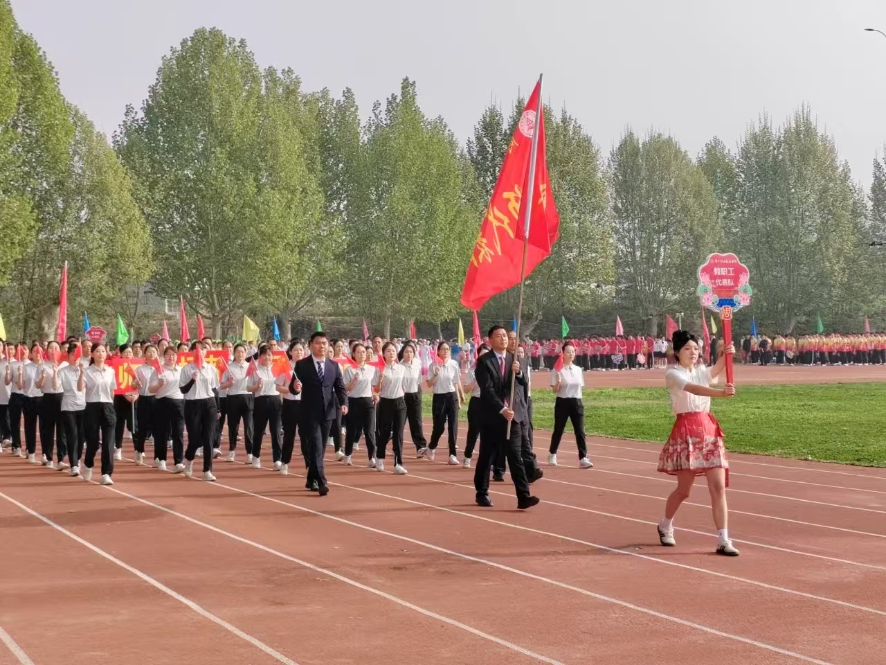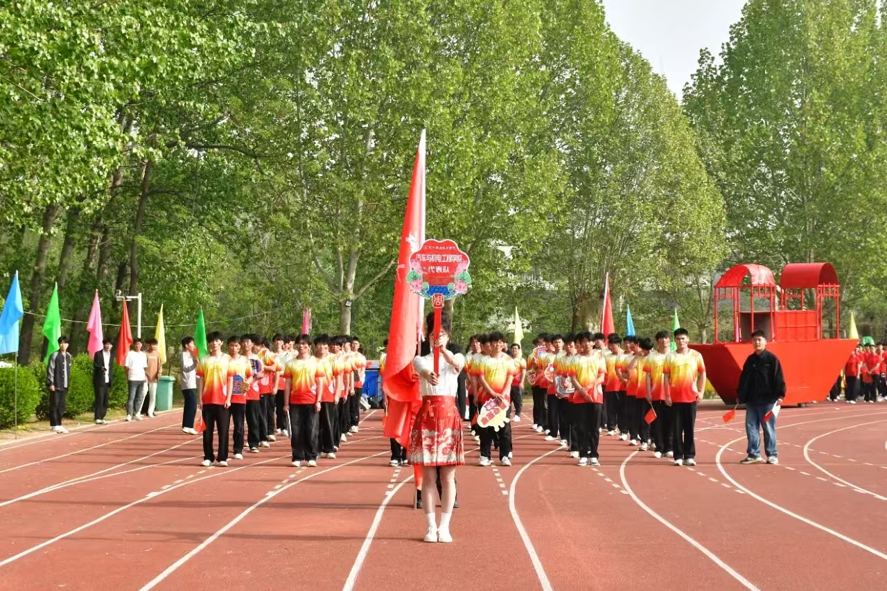 队伍最前方,是身姿挺拔的引导员,手持引导牌,引领着整个方阵。其后,旗手身姿矫健,高擎院旗,院旗在微风中猎猎作响,庄重而威严。紧随旗手的是李院长,他面带微笑,步伐稳健,展现出学院领导的风采。方阵中,同学们整齐划一地挥舞着手中的小红旗,鲜艳的红色随着步伐律动,形成一道亮丽的流动风景线。同学们手举的牌子上写着鼓舞人心的话语,彰显出学院师生积极向上、勇于拼搏的精神风貌。