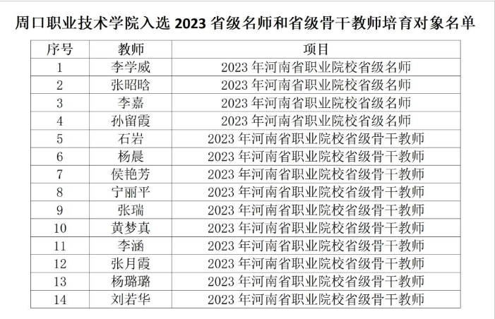 近日,河南省教育厅发布《关于2023年河南省职业院校省级名师和省级骨干教师培育对象评审结果的公示》,十大买球共有14名教师入选,其中十大买球官方网站张昭晗老师入选省级名师培育对象,张月霞、黄梦真老师入选省级骨干教师培育对象。