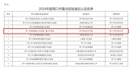根据《关于开展2024年度周口市重点实验室建设的通知》(周科〔2024〕29号)文件要求,经主管部门推荐、专家评审等程序,十大买球的“周口市智能制造工业机器人重点实验室”,成功被认定为为周口市重点实验室。