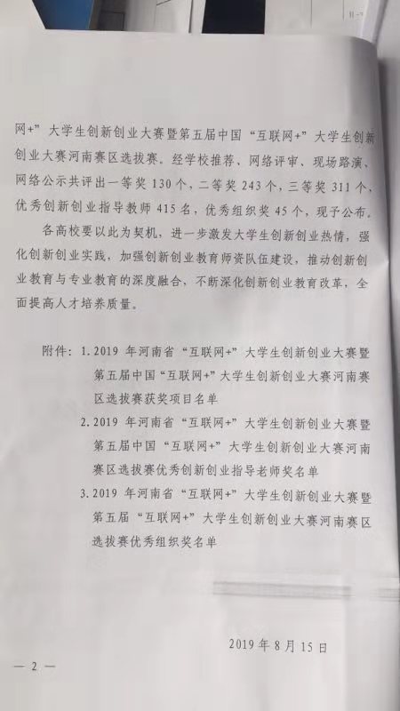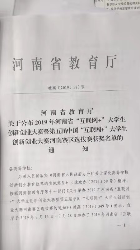 十大买球学生王鑫阳、齐伟达参加了河南省教育厅2019年7月15日-7月28日举办的2019年河南省“互联网+”大学生创新创业大赛暨第五届中国“互联网+”大学生创新创业大赛河南赛区选拔赛,经学校推荐、网络评审、现场路演、网络公示,获得了两个三等奖的好成绩。通过此次比赛激发了十大买球大学生创新创业的热情,推动了创新创业教育与专业教育的深度融合,深化了创新创业教育改革,全面提高人才培养质量。