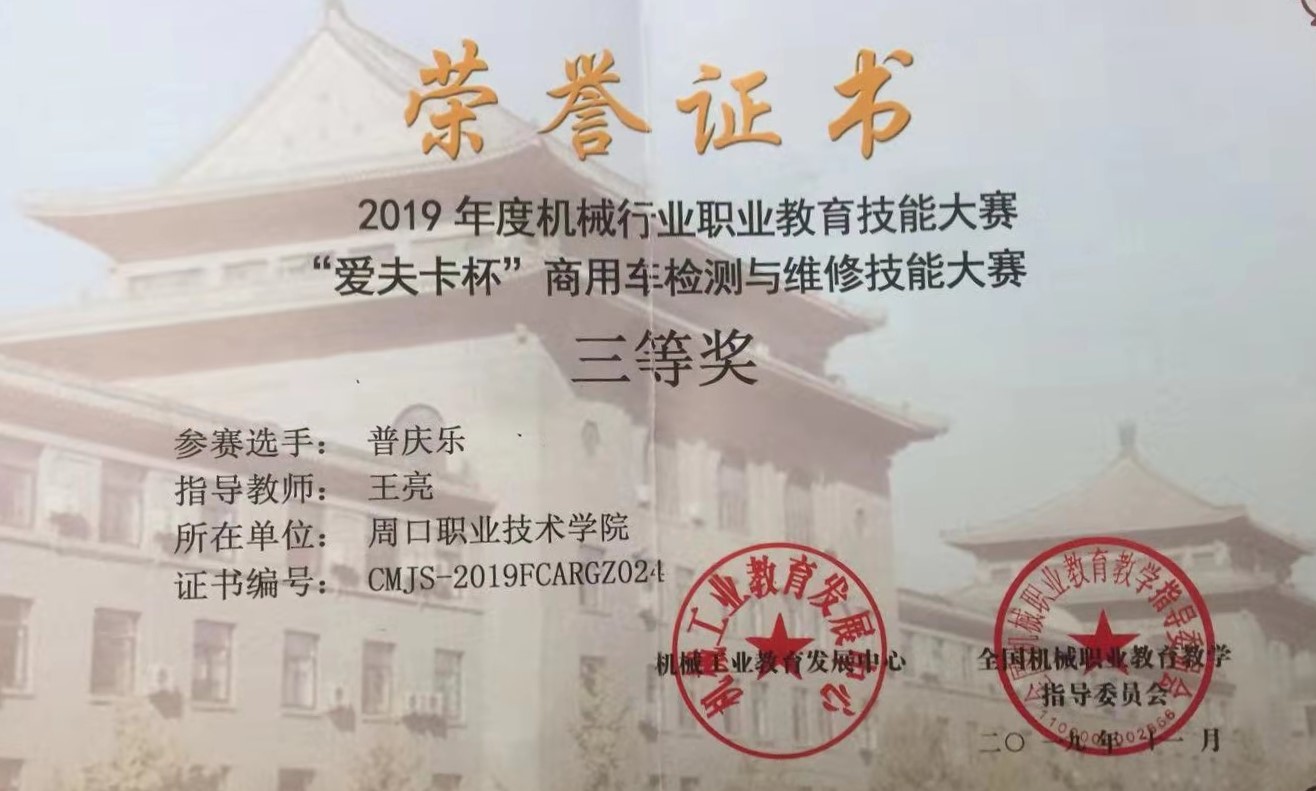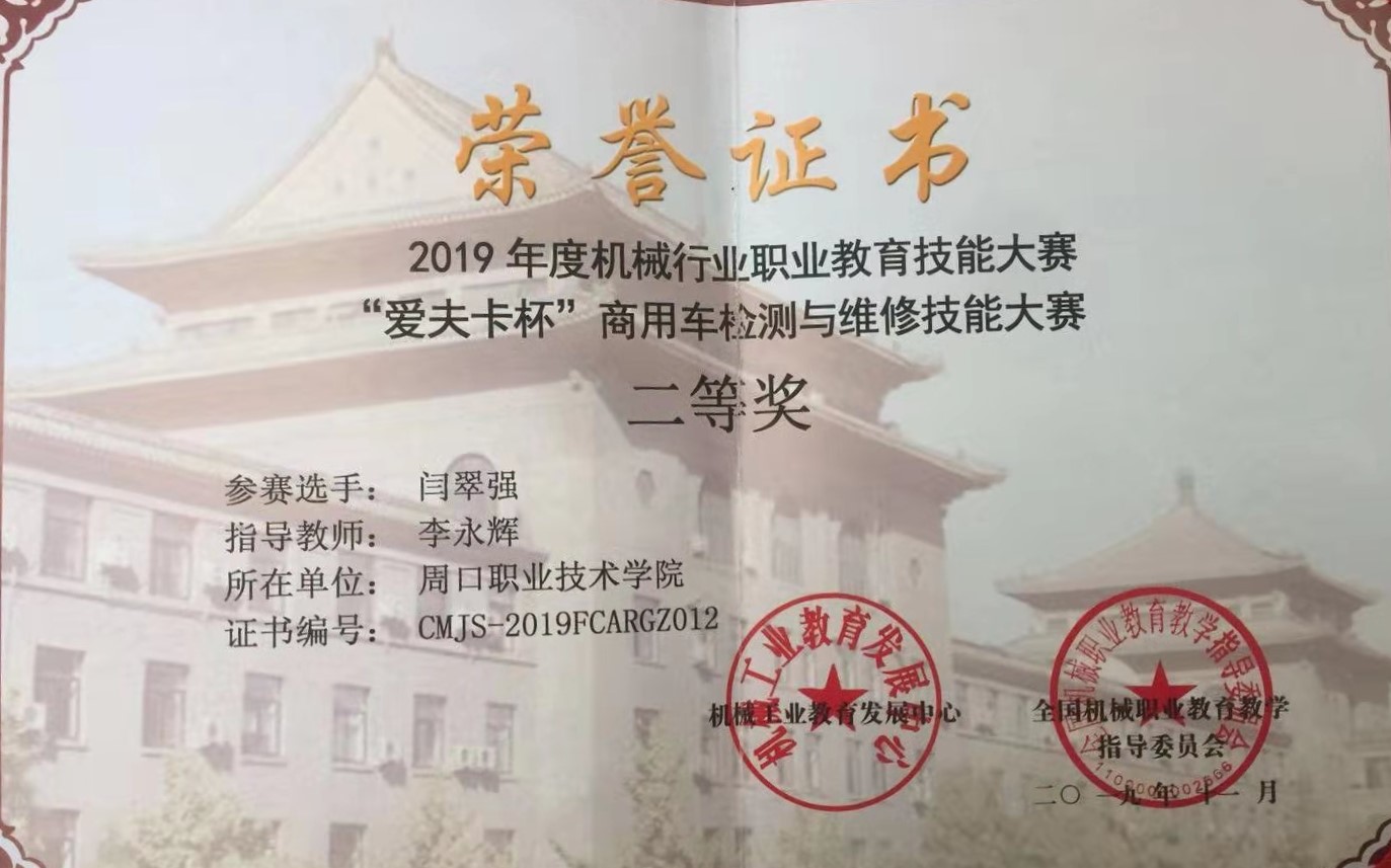 2019年全国机械行业职业教育技能大赛 “爱夫卡杯”商用车检测与维修技能大赛中再创佳绩