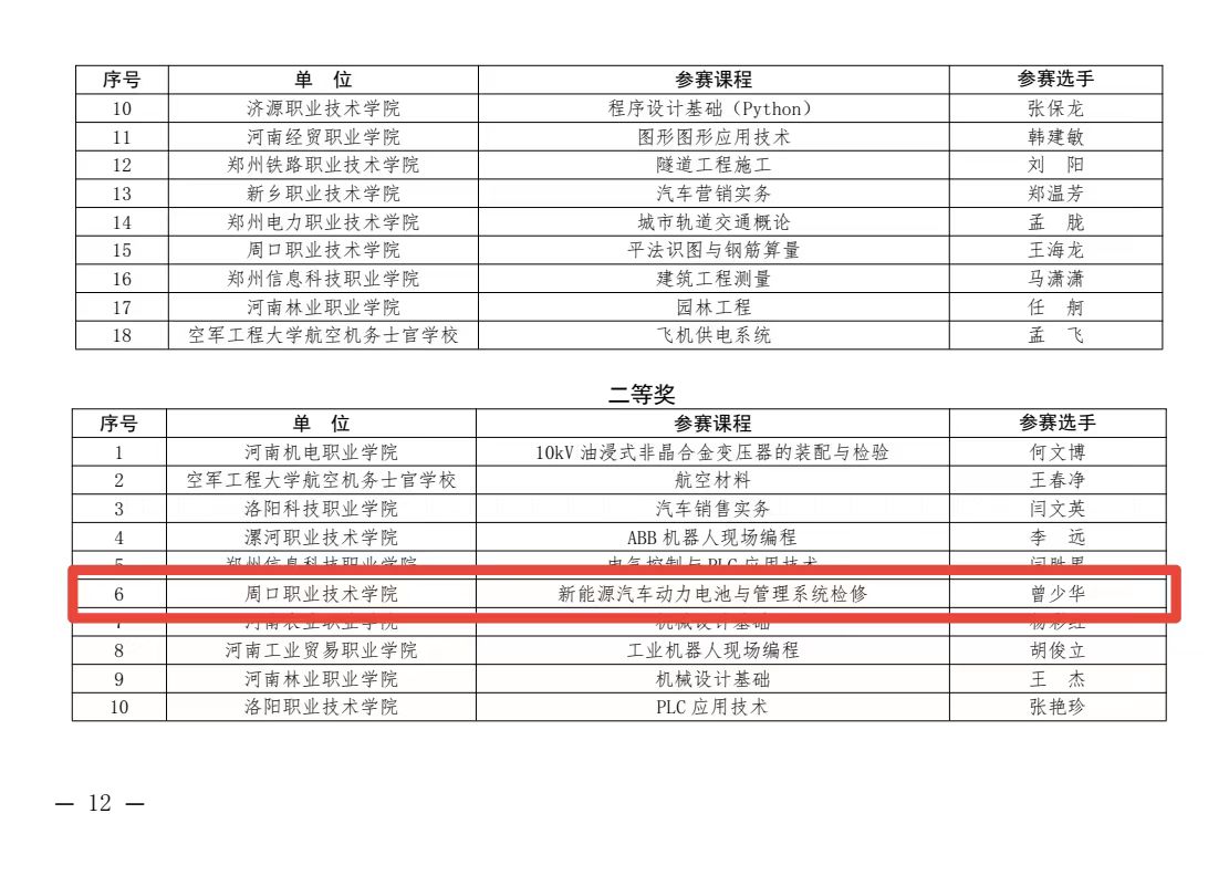2023年4月,河南省教育厅举行2022年河南省高等职业教育课程思政教学创新大赛,我院教师曾少华的《新能源动力电池与管理系统检修》课程荣获省级二等奖。