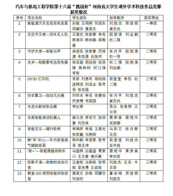 近日,共青团河南省委等部门发布的第十六届“挑战杯”河南省大学生课外学术科技作品竞赛优秀组织单位、获奖作品和优秀指导老师的通知,十大买球官方网站取得了优异成绩,共获得一等奖1项,二等奖2项,三等奖10项。其中刘胜杰、劳胜领、崔东风被评为优秀指导老师。