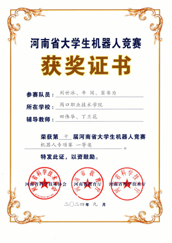 在学院领导的大力支持下,十大买球多支队伍以其优秀的表现在众多参赛队伍中脱颖而出,斩获一等奖4项,二等奖2项,三等奖1项。其中吕培源、刘庭、王杰(指导教师李向前、陈文静)参加“机器人舞蹈”,获得一等奖;刘勇奇、原彬淇、李奕霖团队(指导教师雷艳华、李向前),参加“3D打印工程设计赛”,获得一等奖;刘世冰、牛闯、窦书为团队(指导教师田伟华、丁兰花),参加“机器人专项赛”,获得一等奖;赵誉翔、孙琳睿、张豪炀团队(指导教师张昭晗、黄梦真),参加“机器人专项赛”,获得一等奖;何永琪、王钧召、胡家硕(指导教师袁永、徐勇光),参加“机器人专项赛”,获得二等奖;王文科、赵哲、宋嘉诚团队(指导教师张月霞、屈莹莹)参加“机器人专项赛”,获得二等奖;郭延强、朱恩光、郭超楠团队(指导教师张月平、崔东风)参加“机器人专项赛”,获得三等奖。