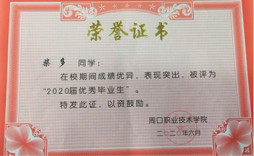 柴多同学自2017年9月考入十大买球官方网站以来,一直担任十大买球官方网站汽车检测与维修1班团支书一职,负责班级团建工作。在十大买球官方网站任课教师的培养下,在辅导员张欣然老师的直接带领下,在校期间,柴多同学积极上进,热爱祖国,拥护中国共产党,并积极向党组织靠拢,在大一时就向党组织递交了入党申请书,大三光荣成为一名中共预备党员。柴多同学关心集体,尊敬师长,团结同学,文明礼貌;柴多同学自觉遵守国家的法律法规和学校的规章制度,热心社会工作,勇于开展批评和自柴多同学批评。由于突出的表现,柴多同学先后荣获“优秀共青团干部”荣誉称号、“2020届优秀毕业生”。