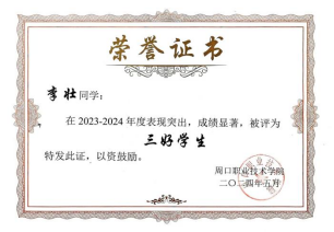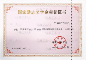 自入学以来,李壮同学在学习上始终保持着高度的自律和刻苦精神。课堂上,他全神贯注,认真聆听老师的每一句话,积极思考,踊跃回答问题;同时,在课下李壮同学积极学习专业技能知识,通过实操来锻炼自己的操作能力,李壮同学的成绩在班级和年级中始终名列前茅,在2024年度被评为周口职业技术“三好学生” ,同时在2023-2024学年荣获国家励志奖学金。同时李壮同学积极参与创新创业大赛,通过自身的努力以及团队的协作,在2024年河南省大学生创新大赛暨中国国际大学生创新大赛河南赛区选拔赛中,荣获三等奖。