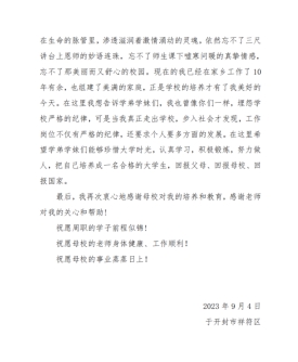 此次活动,加强了师生之间的交流,增进了师生之间的感情,加强了平等、民主、愉悦的新型师生关系。同时让每个学生在活动中深入理解了老师的辛苦,真正体会感悟到人民教师无私奉献的高尚师德,也对学校严管厚爱有了更多的理解和支持,激发了在校学生的感念师恩、感恩母校之情。