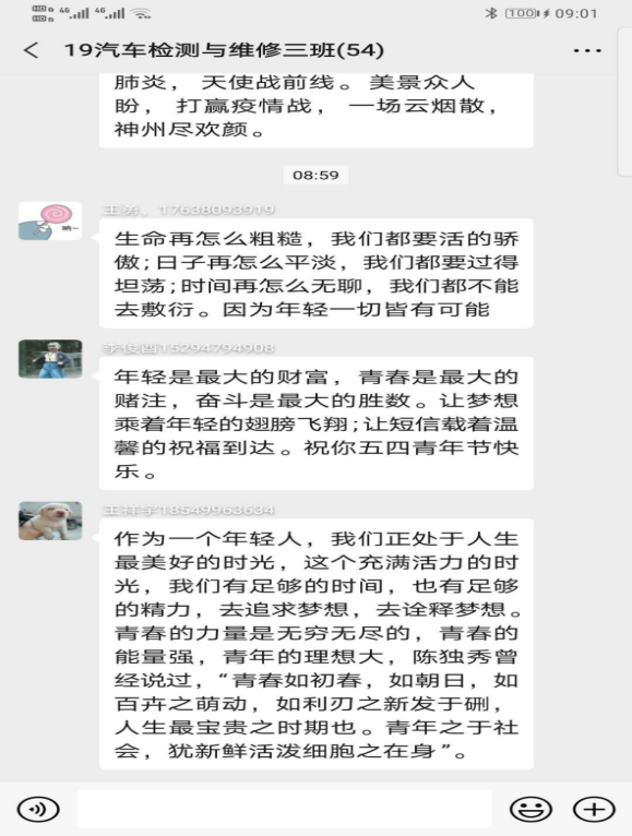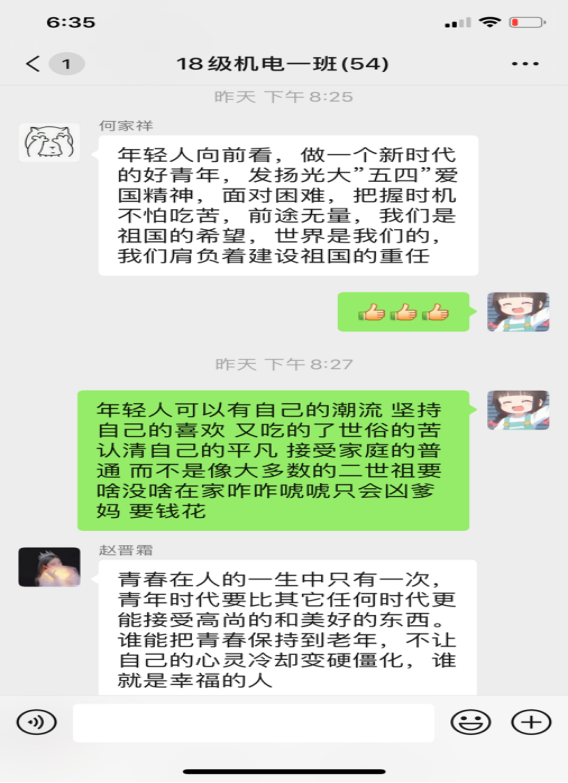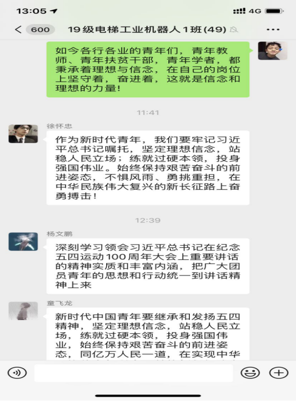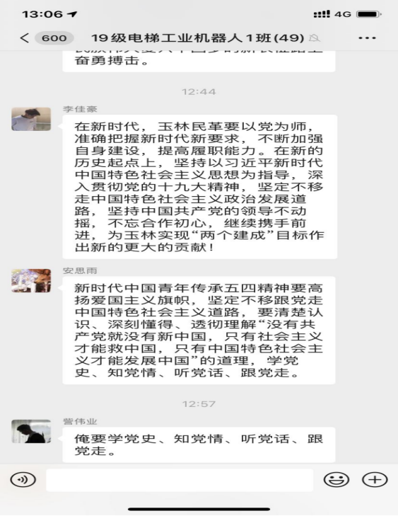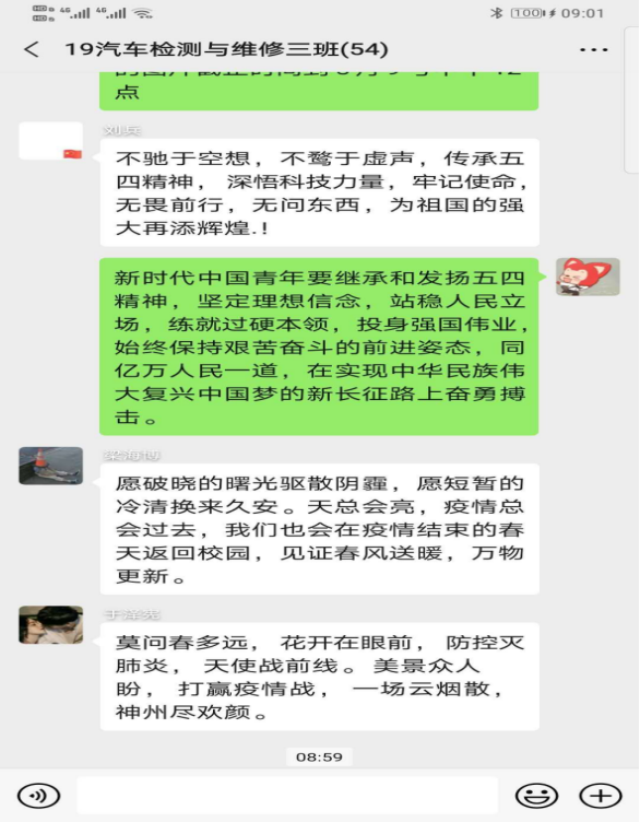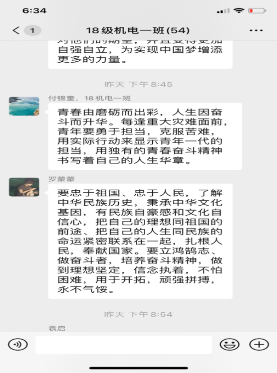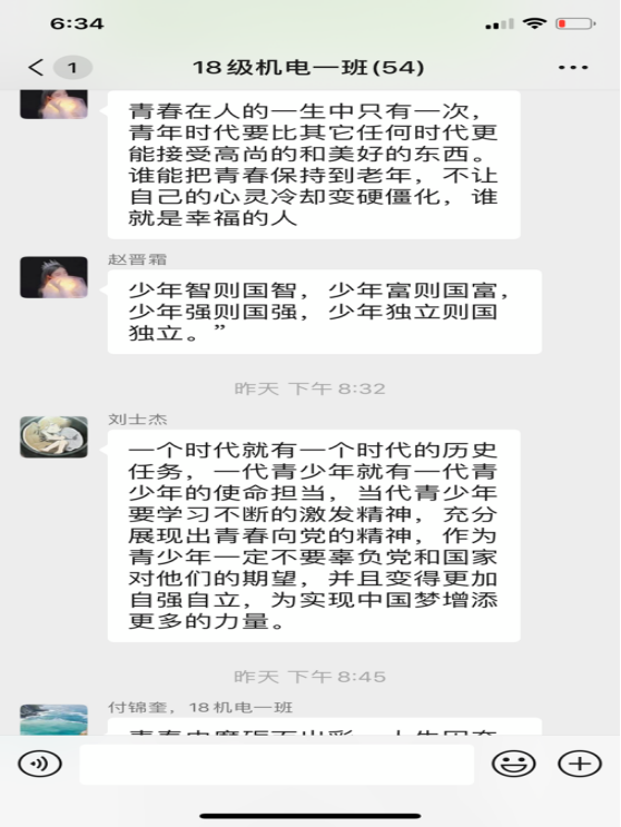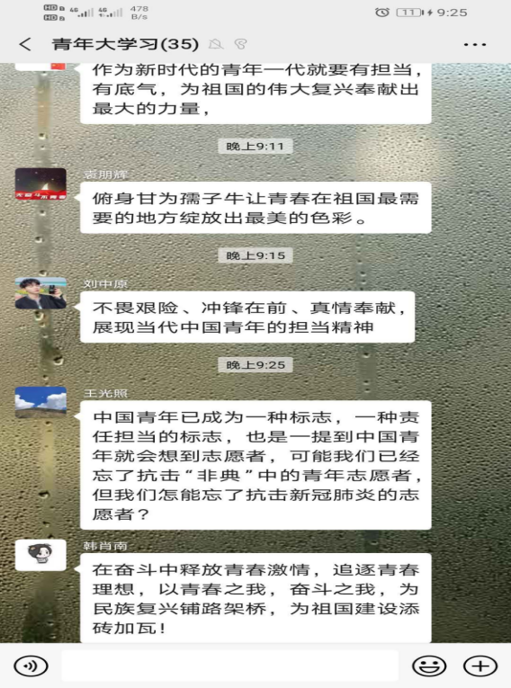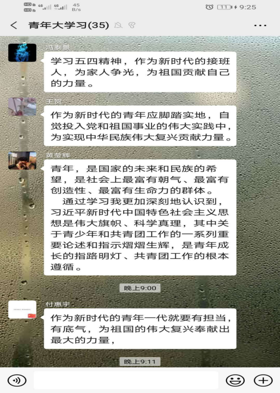 本期团课围绕学习习近平总书记五四寄语精神,结合高校返校复学的时间节点,广大青年学生学习劲头热情高涨,纷纷以观看视频、微信群讨论、朋友圈分享等多种形式各班展开学习,下面为部分学生学习瞬间。