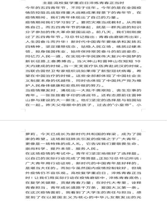 习近平总书记指出,青春由磨砺而出彩,人生因奋斗而升华。面对突如其来的新冠肺炎疫情,全国各族青年积极响应党的号召,踊跃投身疫情防控人民战争、总体战、阻击战,不畏艰险、冲锋在前、真情奉献,展现了当代中国青年的担当精神,赢得了党和人民高度赞誉。