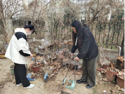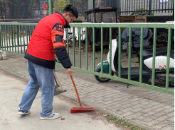 大家手持长夹、扫把等工具,分成小队清理垃圾。一队沿着绿化带一边走,一边搜寻清理散落在草丛中果皮纸屑、塑料袋、生活垃圾等。一队清理道路上的垃圾及道路两边未融化的积雪。